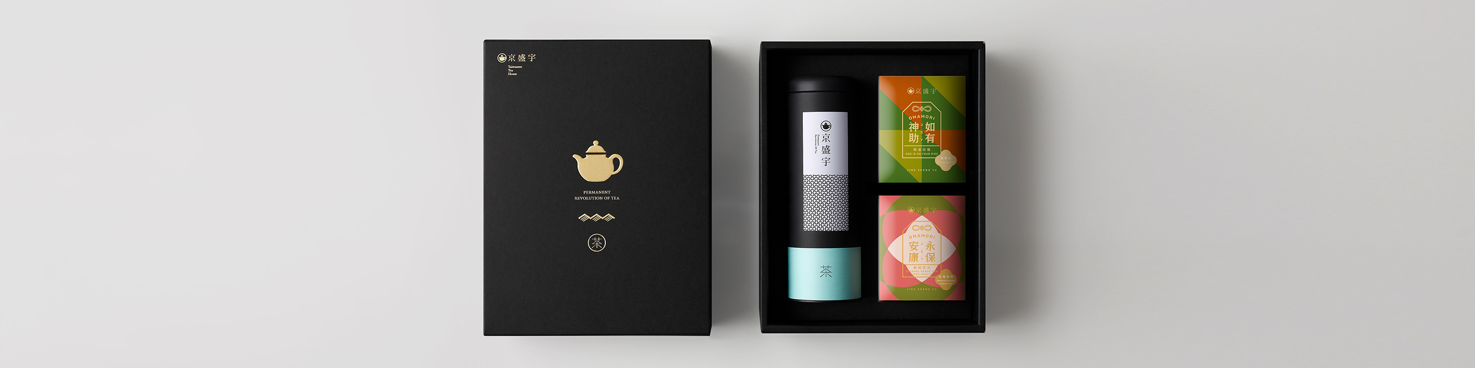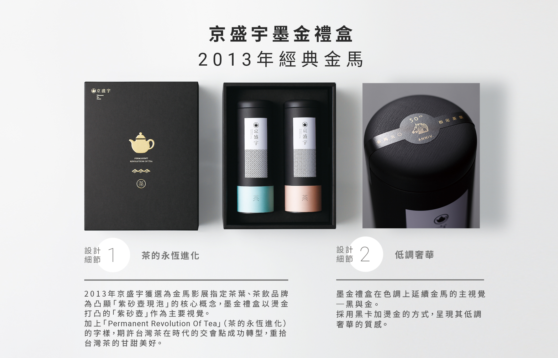 很榮幸,在2013年京盛宇獲選為金馬獎第五十屆指定茶葉品牌,適逢金馬影展五十週年,在這個別具歷史意義的重要時刻,精心設計了「墨金禮盒」,作為上千位貴賓的指定禮品。在設計發想的時候,希望能用最簡單的元素打造最低調的奢華,因此,在色調上延續金馬的主視覺─黑與金。然後採用黑卡加燙金的方式,並刻意突顯京盛宇「紫砂壺手沖」的核心概念,以燙金加上打凸的「紫砂壺」作為禮盒的主要視覺,並加上「Permanent Revolution Of Tea」(茶的永恆進化)的字樣,期許台灣茶在時代的交會點成功轉型,讓更多人感受台灣茶的甘甜美好。