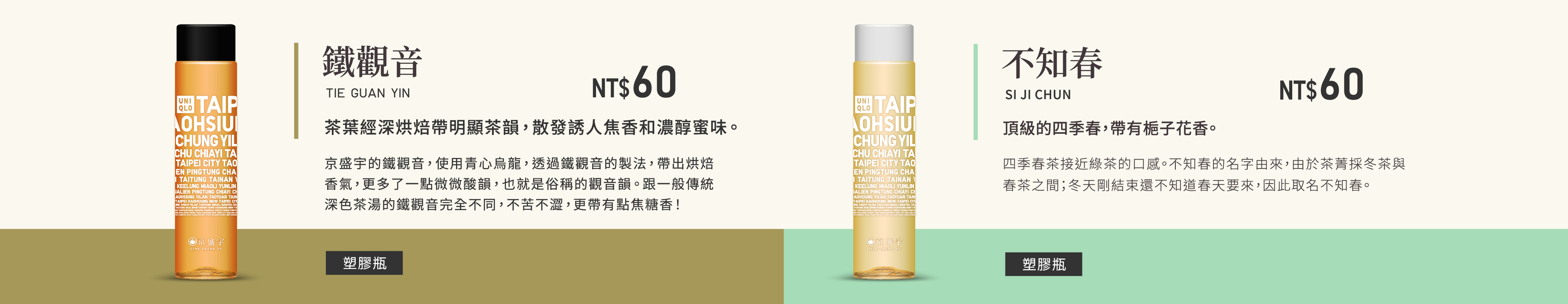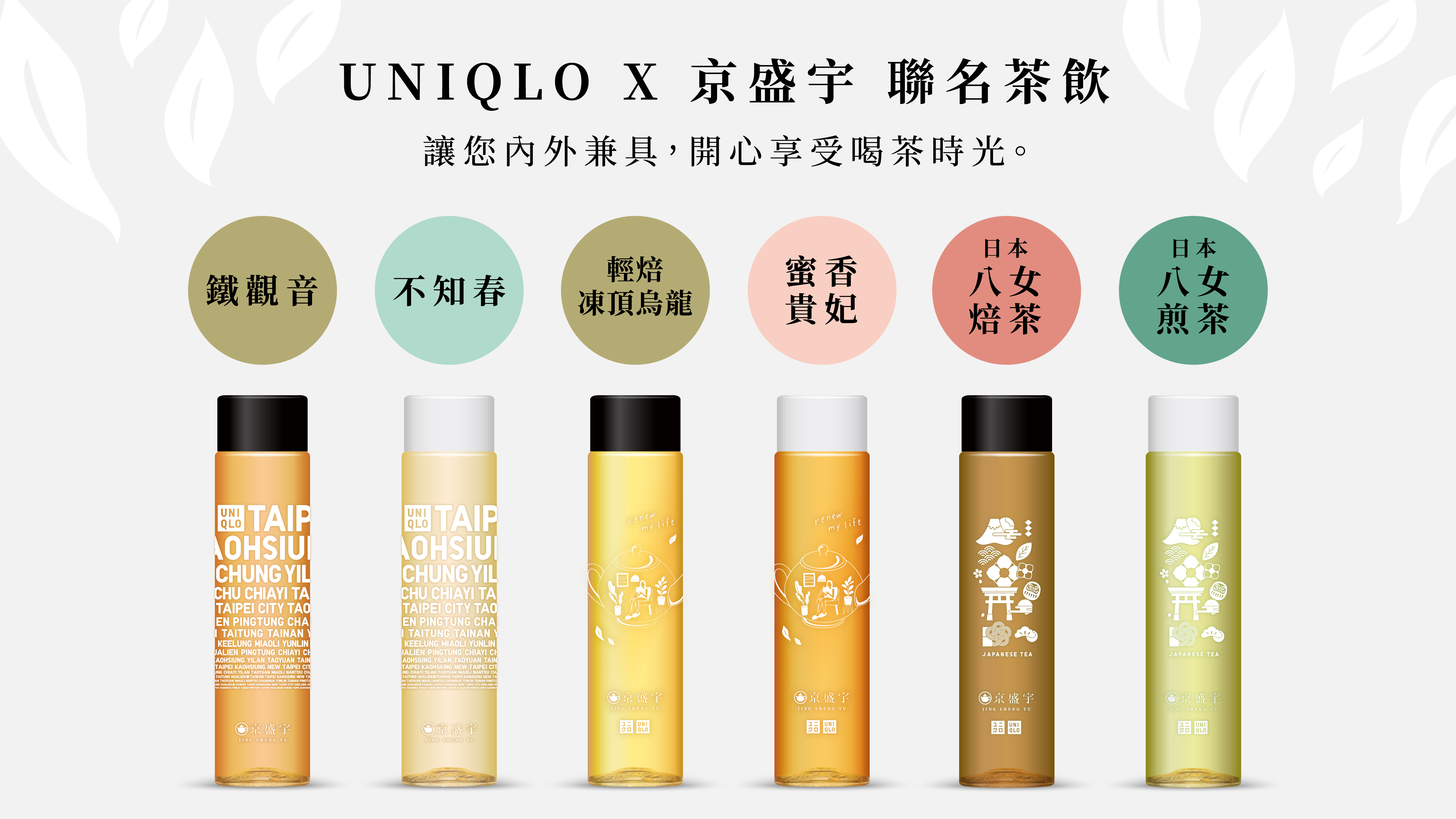 UNIQLO 獨家設計了多款聯名隨身瓶,2款是採經典圖案的「城市瓶」,採PET材質,風味是不知春、鐵觀音;2款是為本次合作專屬設計的「插畫瓶」,採PET材質,風味是蜜香貴妃、輕焙凍頂烏龍,以及於2023年京盛宇世界選茶精選來自於日本人氣茶區,推出兩款全新設計隨身瓶,風味為日本八女煎茶與八女焙茶。以上每瓶均為60元。