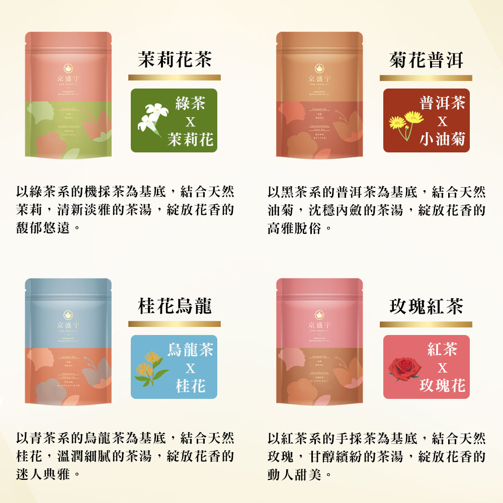 香片是一種花茶的統稱,大家最常喝到的香片大多是加茉莉花製成的,所以會以為香片=茉莉花茶,但其實香片也有可能是用桂花或梔子花等其他花製成的。「花茶」是一種獨特茶類,屬於再加工茶,明朝已有文字記載,花茶製法分為:1.窨製 2.拌花。京盛宇的花茶系列,是用拌花,也就是茶包內可以看到乾燥的花瓣。