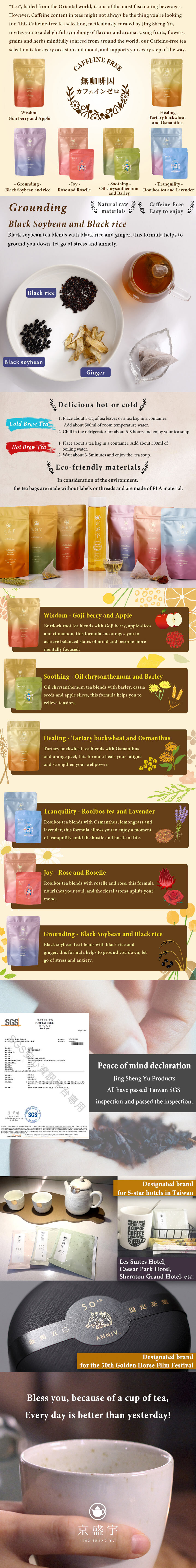 Black soybean tea blends with black rice and ginger, this formula helps to ground you down, let go of stress and anxiety.