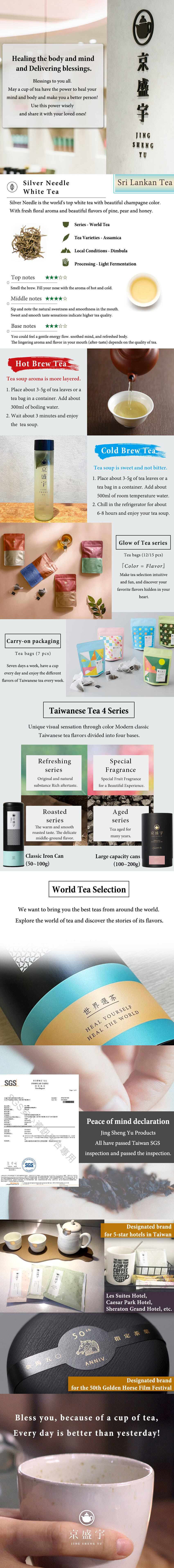 Silver Needle is the world's top white tea with beautiful champagne color. With fresh floral aroma and beautiful flavors of pine, pear and honey.
