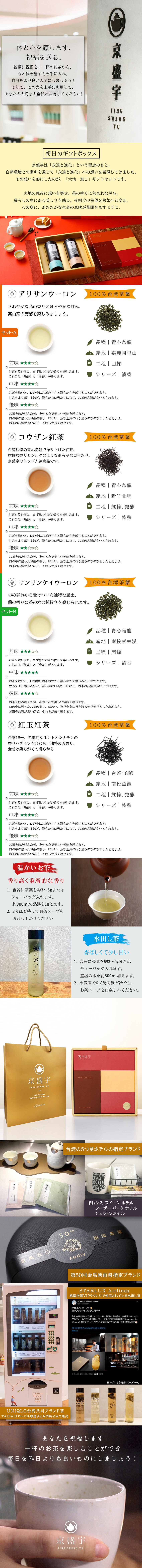 | 賞味期限 | アリサン、サンリンケイ ウーロン-製造日より24ヶ月 コウザン、紅玉紅茶-製造日より36ヶ月 |