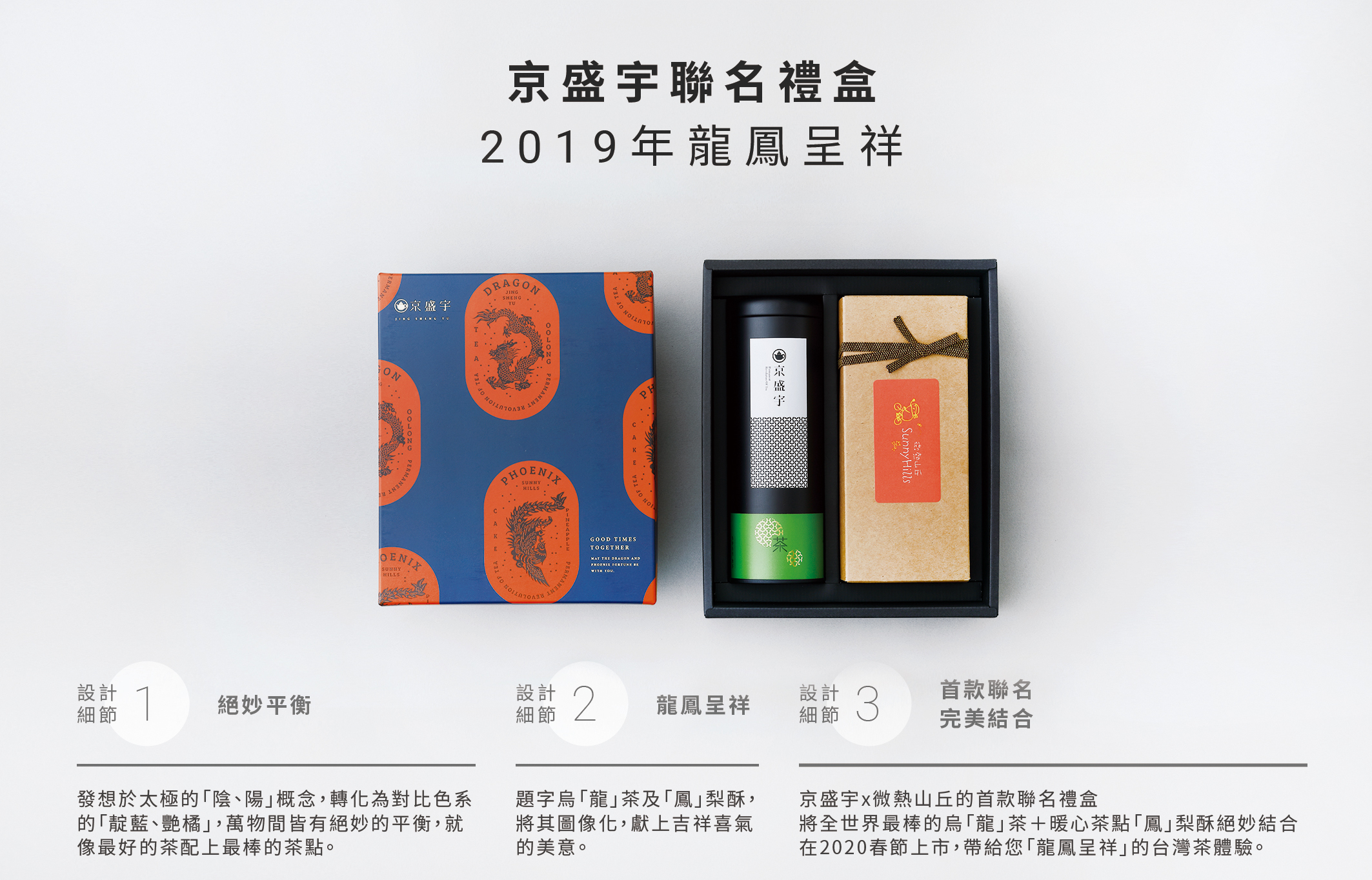於是我們以台灣人日常生活中,最樸實暖心的烏「龍」茶與「鳳」梨酥為靈感,各取茶與茶點的其中一字設計「龍鳳呈祥」禮盒,期盼象徵吉祥如意的龍鳳,能夠為每一個收到禮物的賓客,增添更多的幸福平安、好運連連!