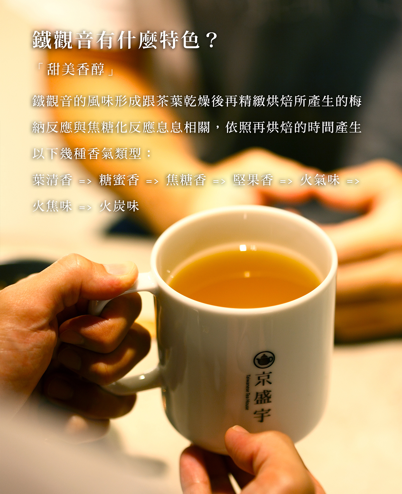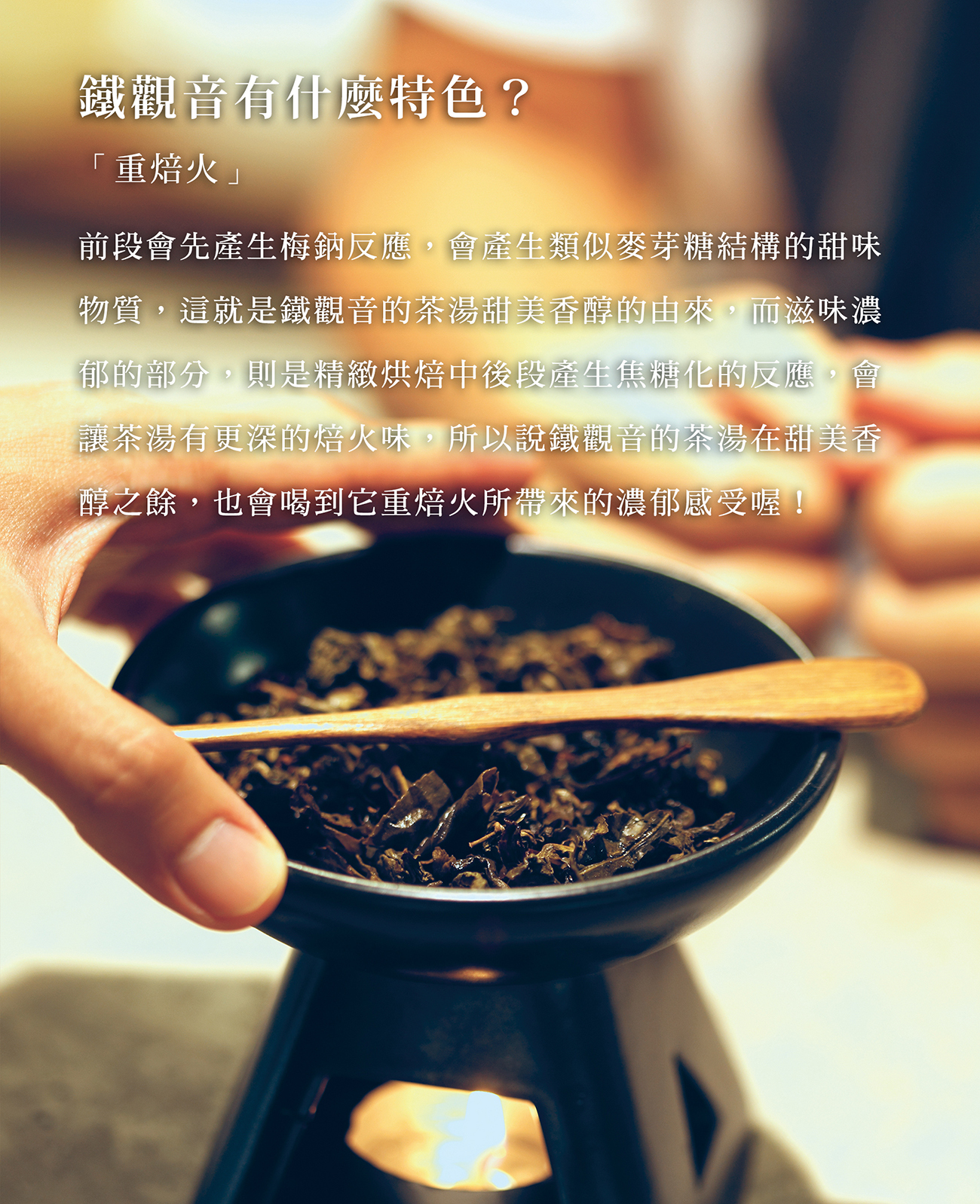 而滋味濃郁的部分,則是精緻烘焙中後段產生焦糖化的反應,會讓茶湯有更深的焙火味,所以說鐵觀音的茶湯在甜美香醇之餘,也會喝到它重焙火所帶來的濃郁感受喔!
