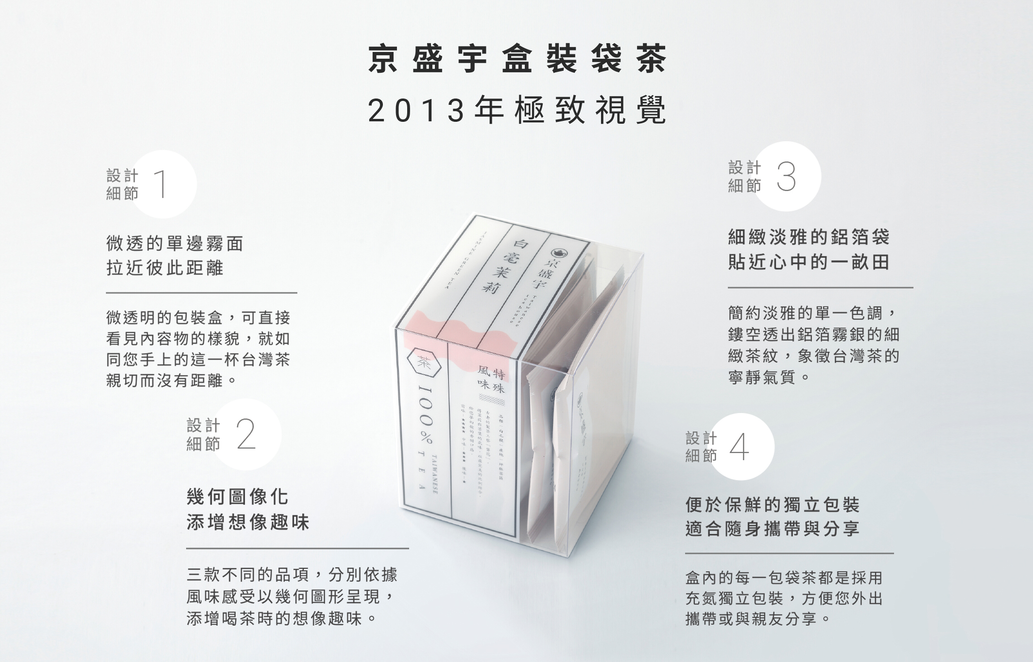 在鐵罐裝袋茶推出二年之後,我相信,增加不同的包裝形式,以及更多元的風味選擇,一定能夠讓更多人享受泡茶的樂趣。於是,採用「單包」的包裝形式,外袋的設計延續一貫對美感的堅持標準:「撕開會聽見心碎的聲音、丟棄會懊悔三天三夜睡不著覺」,所以這款單包袋茶,順利成為國內許多飯店的客房用茶。在外盒上材質的選擇上,因為理解眼球是無法享受茶湯的美好風味,為了讓眼球也能有舒適愉悅的感受,所以採用透明的PET盒,極致化視覺饗宴。