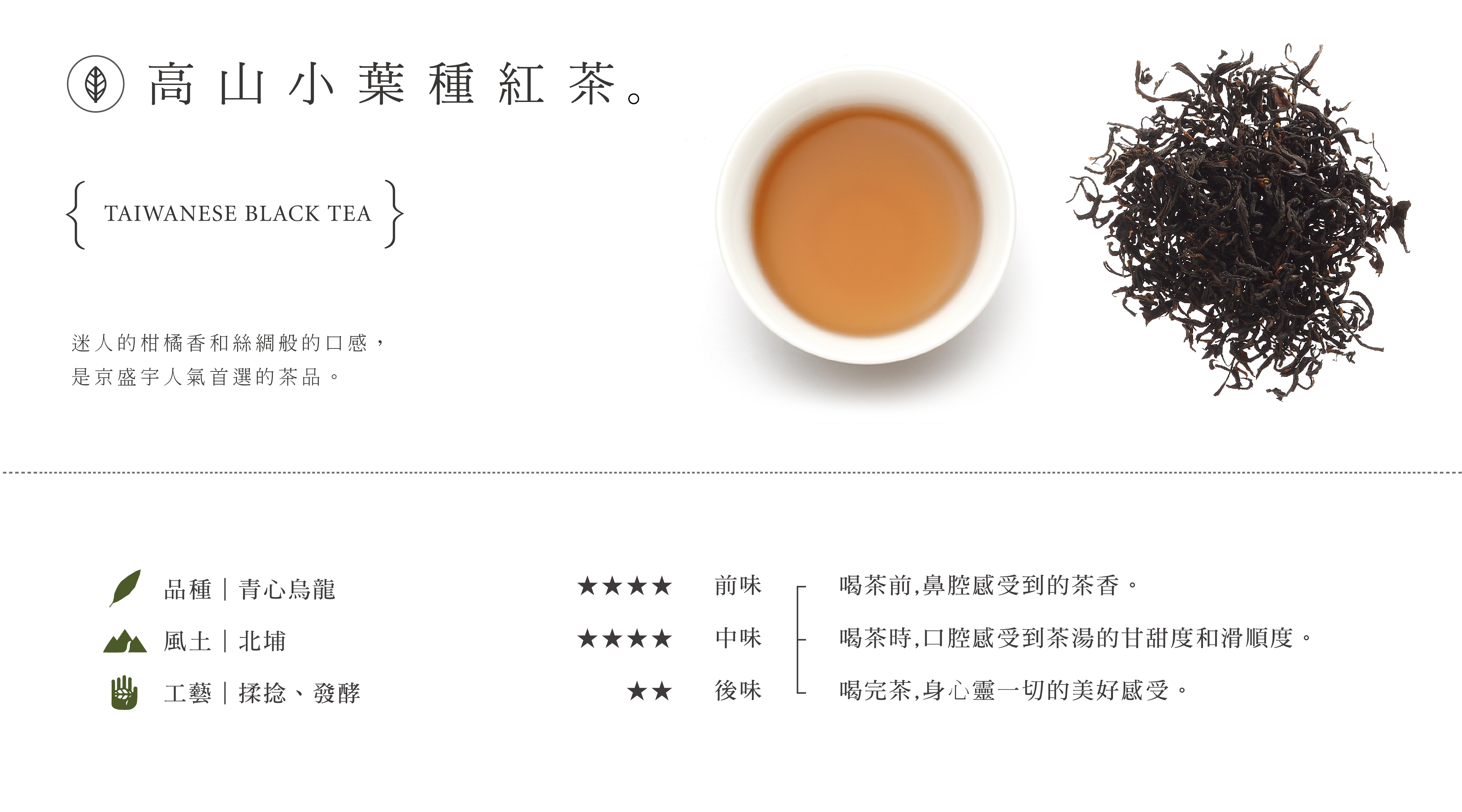 京盛宇的高山小葉種紅茶之所以茶湯細緻滑順的原因,是因為這款茶的先天品種採用的是青心烏龍品種,青心烏龍品種是小葉種,小葉種做成紅茶的口感通常較溫柔滑順,而大葉種做成紅茶的口感通常比較強勢濃郁