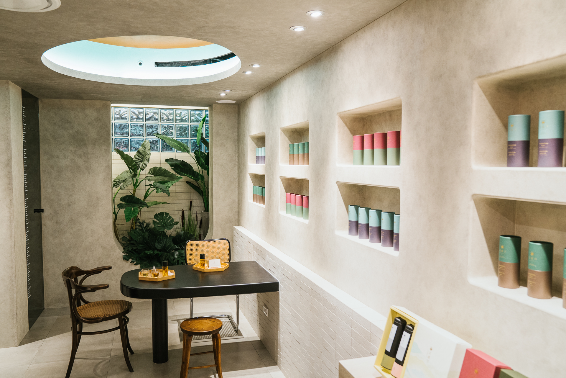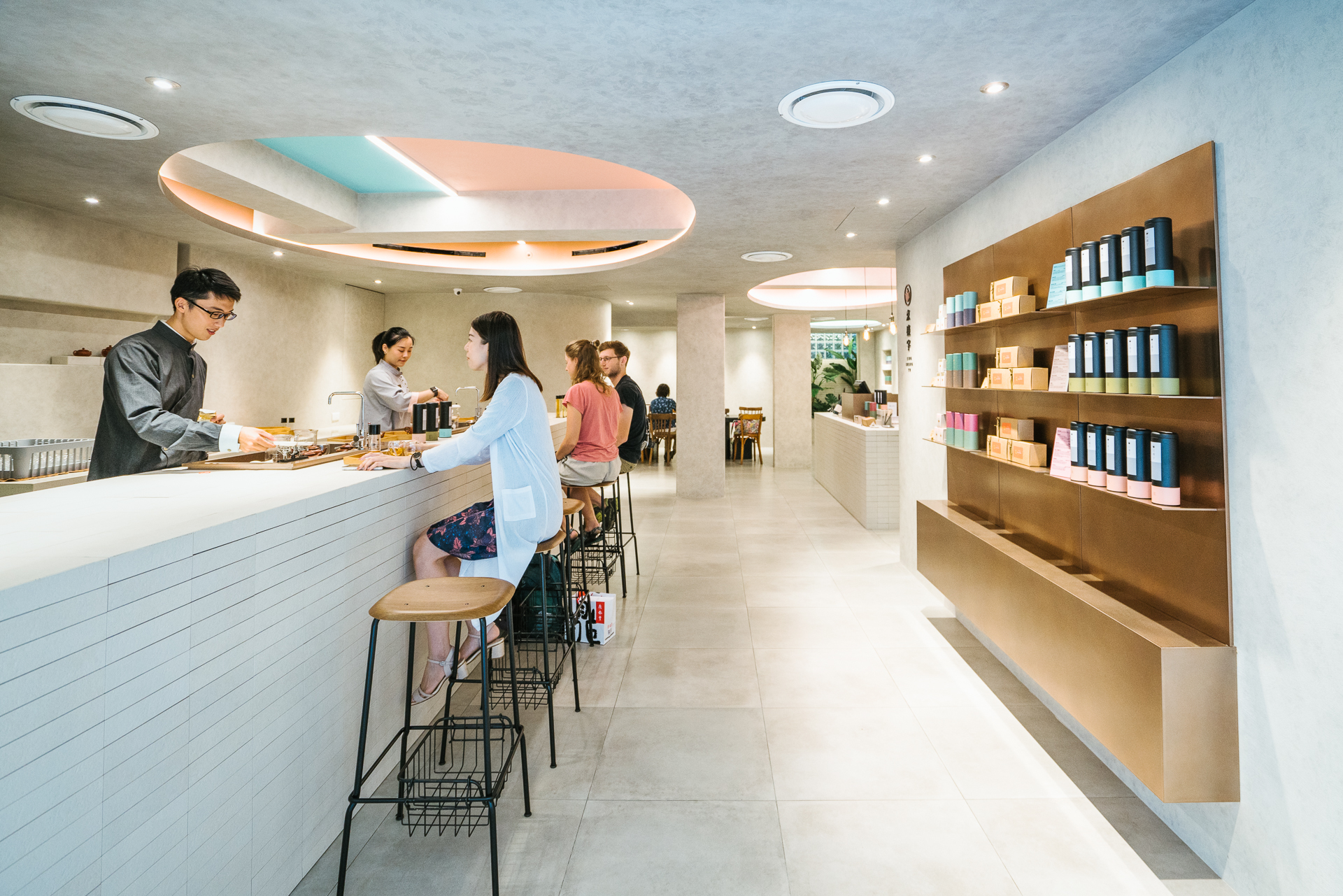 入口處延伸,可以看到另一個同樣用磚材打造的櫃台,呼應著前區的茶吧台,作為商品的結帳區,背牆是一整排的永康概念店主打商品。
