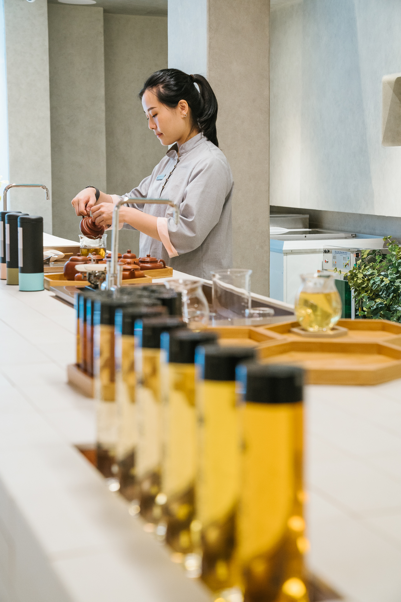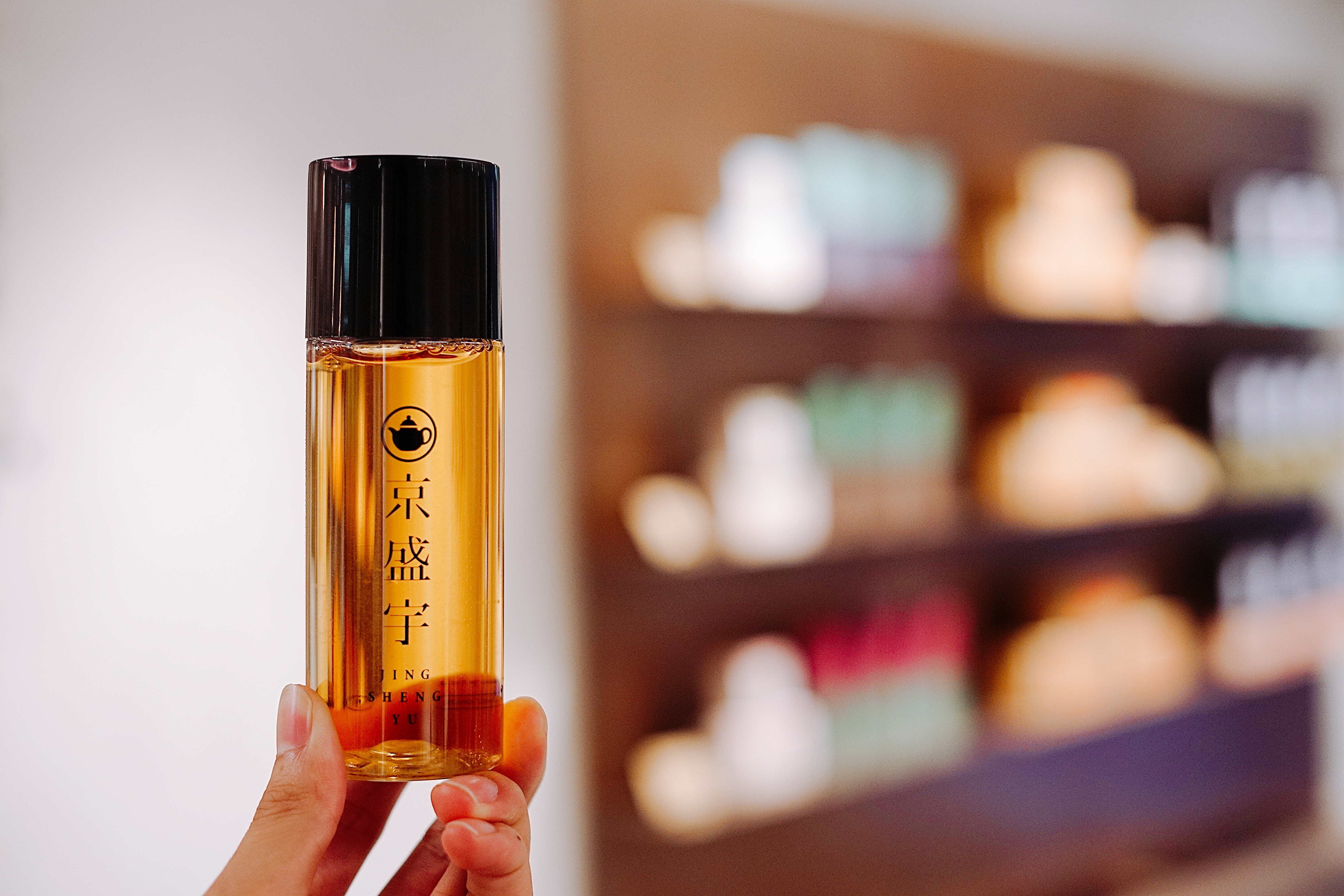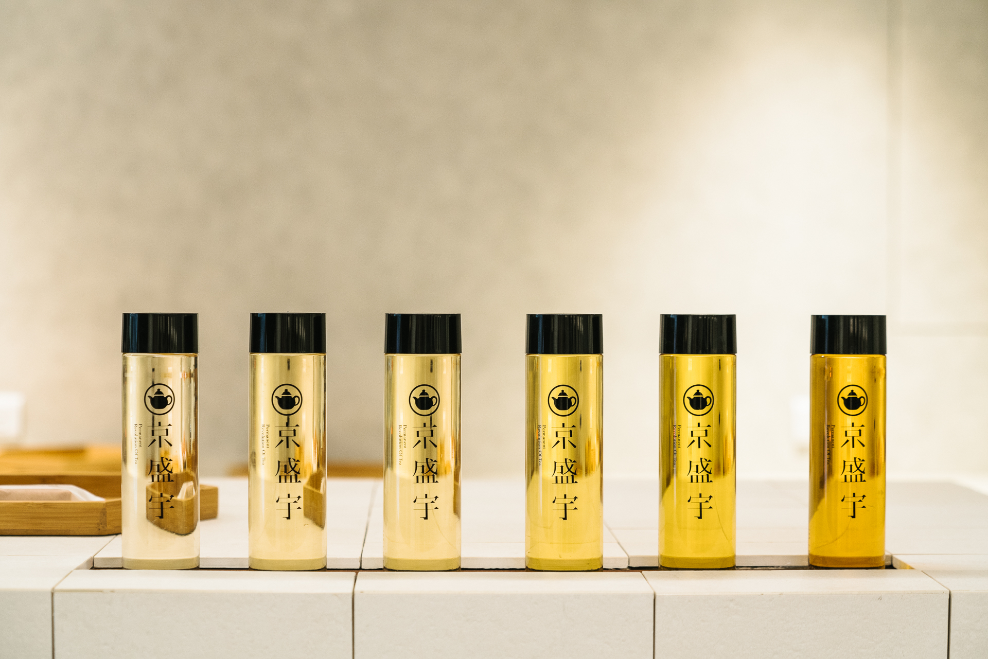 許多人認識京盛宇,是從下面照片裡一瓶瓶紫砂壺手沖茶飲開始。但在永康概念店內,這一瓶瓶茶只是裝飾~ 概念店不販售瓶裝茶飲,改成直接邀請客人內用,好好坐下來一次試飲不同款茶。