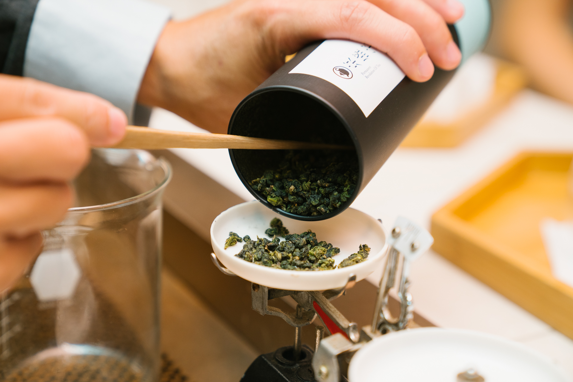 茶藝師正在用天秤秤量茶葉,京盛宇的茶葉都是 100%台灣產,可以看到一顆顆的原葉。
