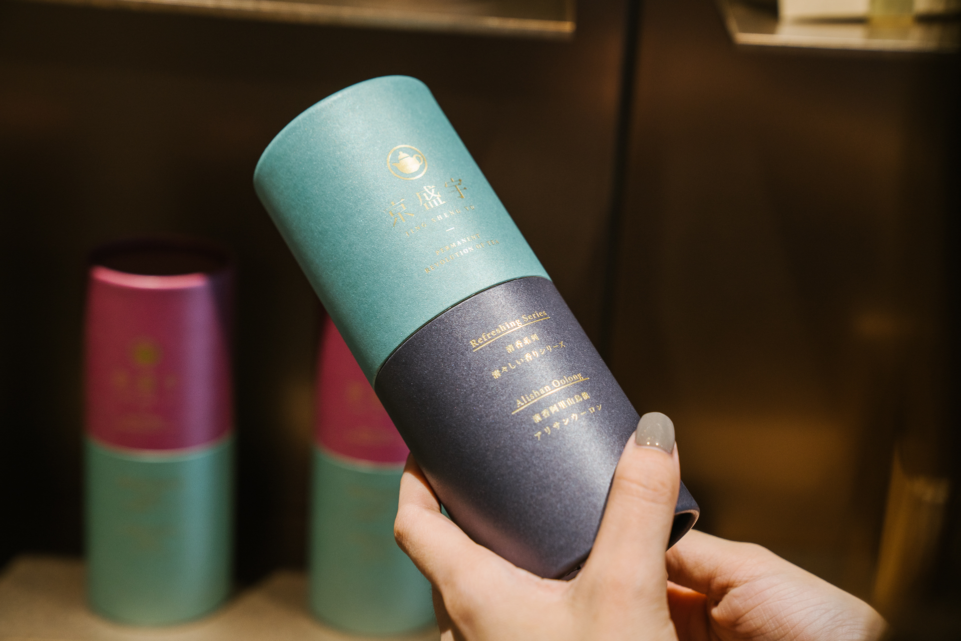 店內一共有京盛宇 15 款 100% 台灣產茶葉商品,右邊的鐵罐是京盛宇的經典商品,其中經典茶款例如:阿里山金萱、東方美人、凍頂烏龍,也有進階茶款例如:杉林溪烏龍、梨山烏龍,定價自NT$480元起,其實比想像中還要好入手。