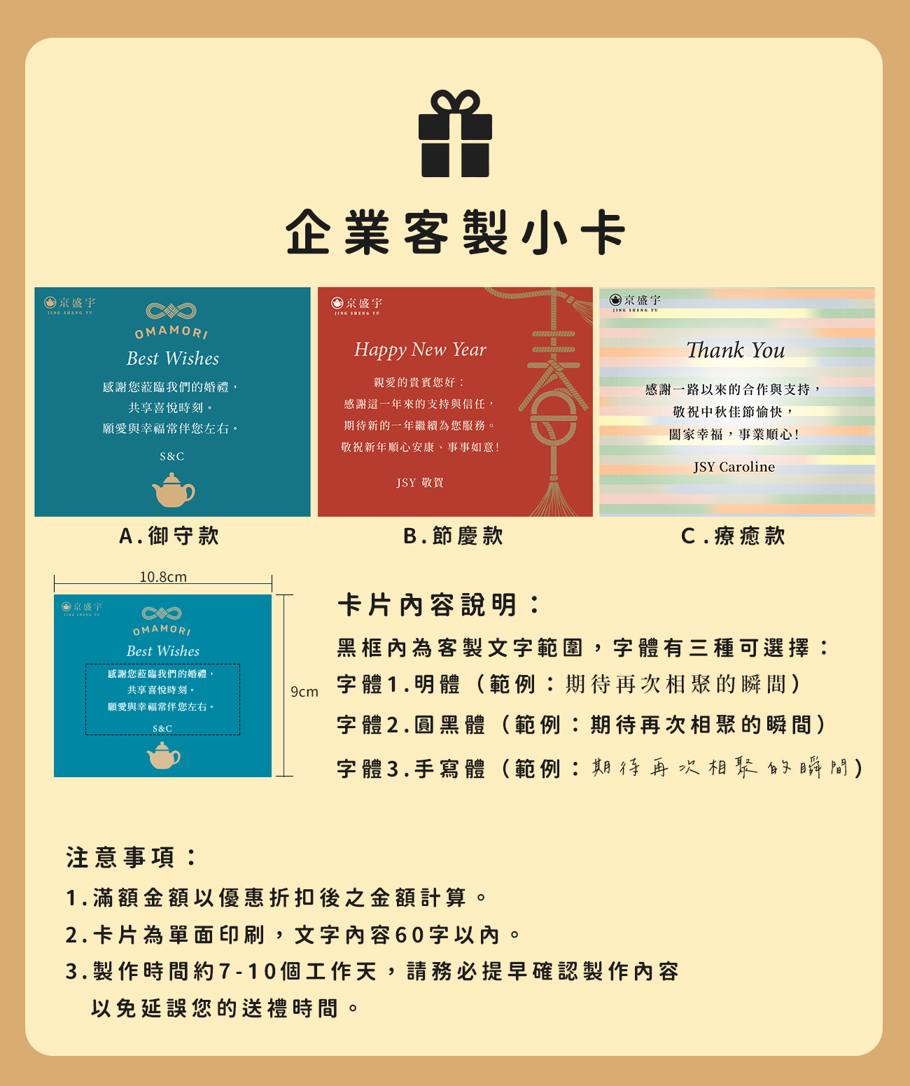 京盛宇特別推出三款風格獨具的客製化小卡。
