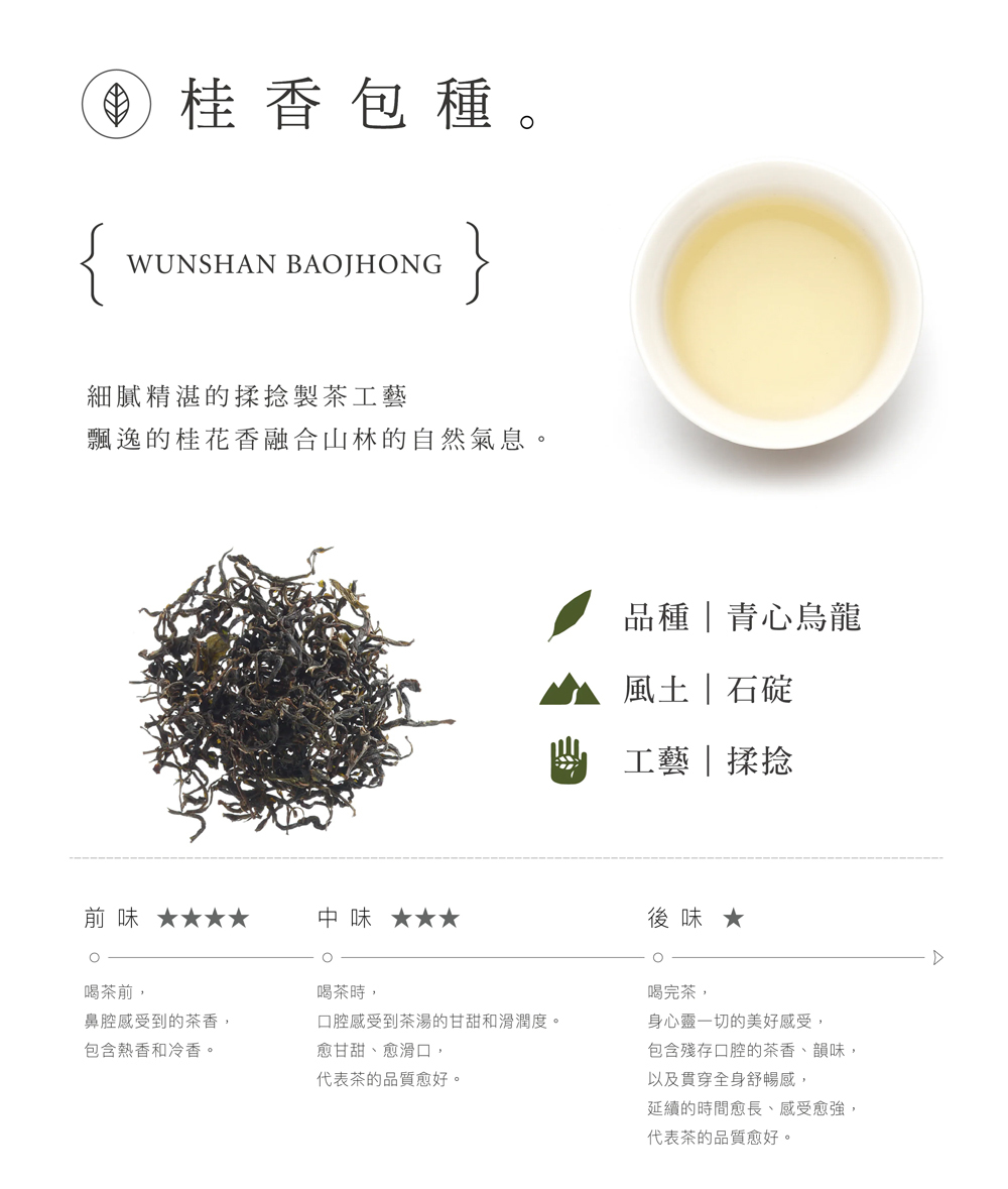 以細膩精湛的揉捻製茶工藝製作的包種茶,特有的天然桂花香搭配融合山林的自然氣息。