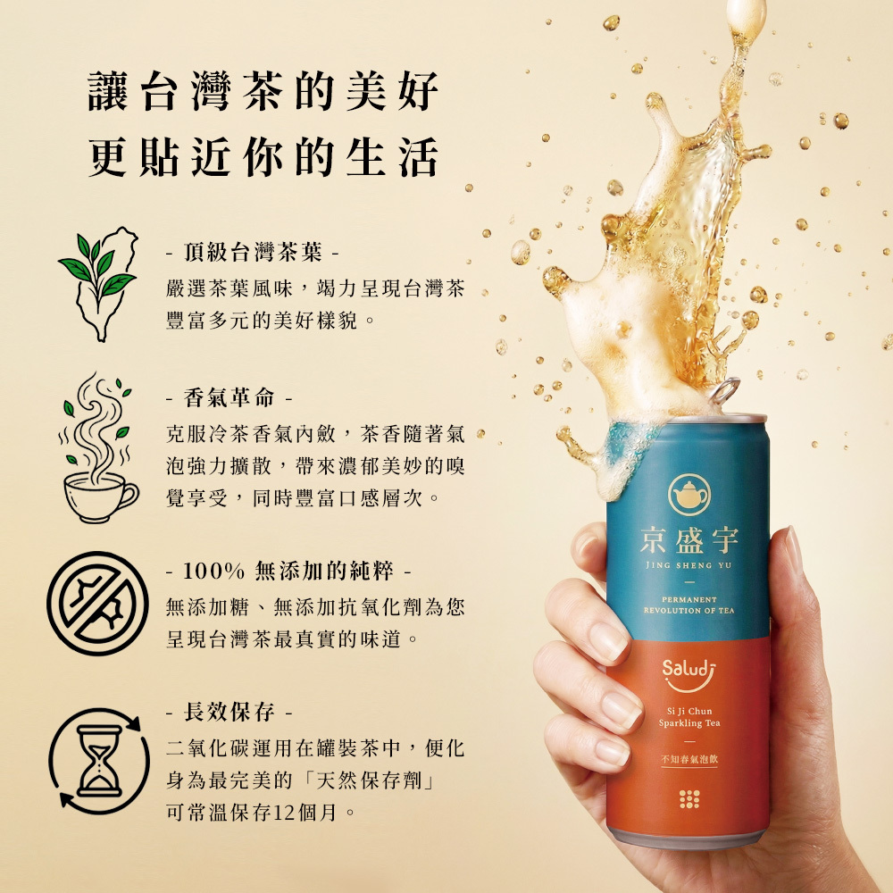 京盛宇全新「台灣茶氣泡飲」將最完美的風味濃縮於瓶中。期盼這杯承載著京盛宇初心的氣泡茶,能真正做到「來去自如、無遠弗屆」,飛往世界上的每一個角落,讓更多人品嚐到台灣茶的極致美好。