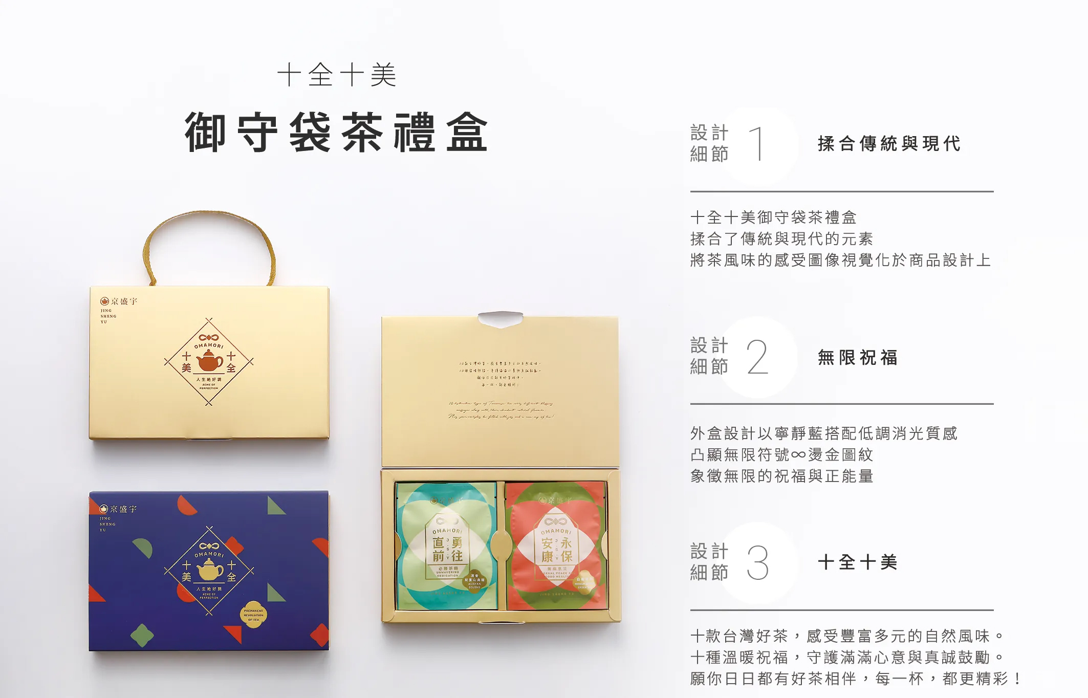 十全十美御守袋茶禮盒,就是一個以利他的起心動念為本,一步步克服許許多多包裝製作上的大小困難,而最終得以實現京盛宇對全世界、對所有人祝褔的商品。「療癒身心、傳遞祝福」是這個產品的主軸,在疫情肆虐的時刻,我希望每個人可以因為一杯茶,得到療癒身心的片刻,同時面對時局的不安、未知,不要對未來失去希望,能夠在拆封每一個包裝的當下,得到包裝上所印刷的正向力量,這樣可以繼續對未來保有希望、熱情、動力,讓每個人可以因為這禮盒裡面的每一杯,每一天都能璀璨、精彩。