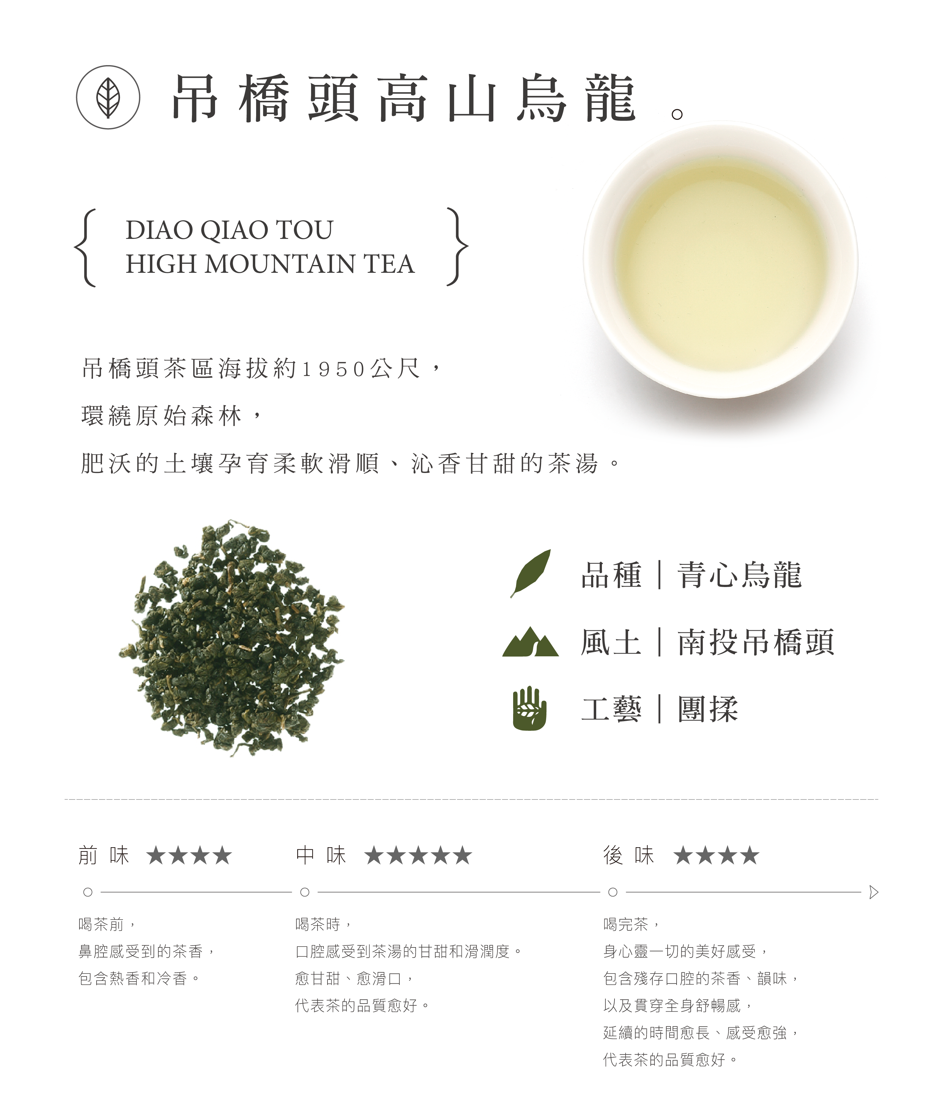 吊橋頭茶區海拔約1950公尺,環繞原始森林,肥沃的土壤孕育柔軟滑順、沁香甘甜的茶湯。