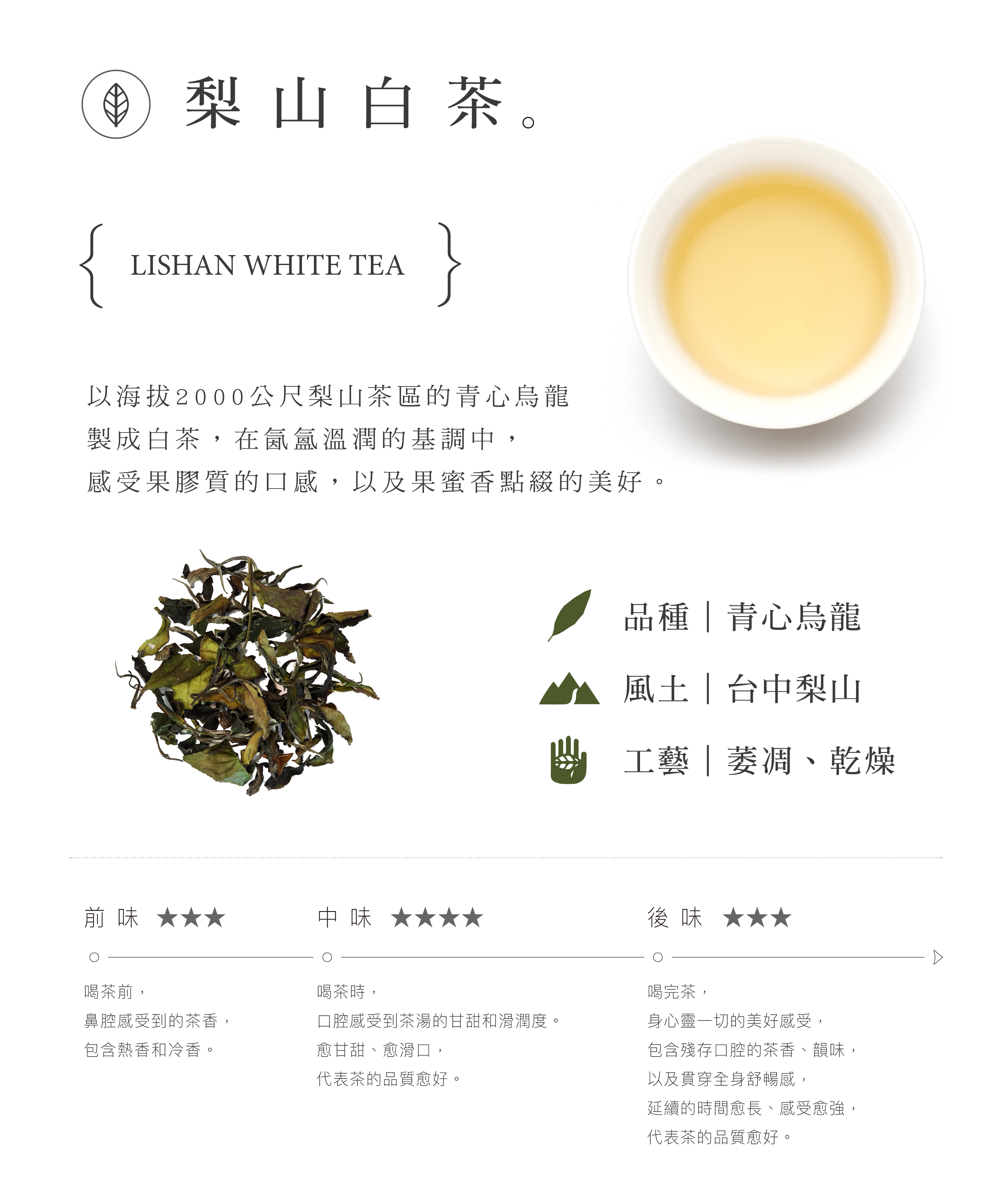 以海拔2000公尺梨山茶區的青心烏龍製成白茶,在氤氳溫潤的基調中,感受果膠質的口感,以及果蜜香點綴的美好。