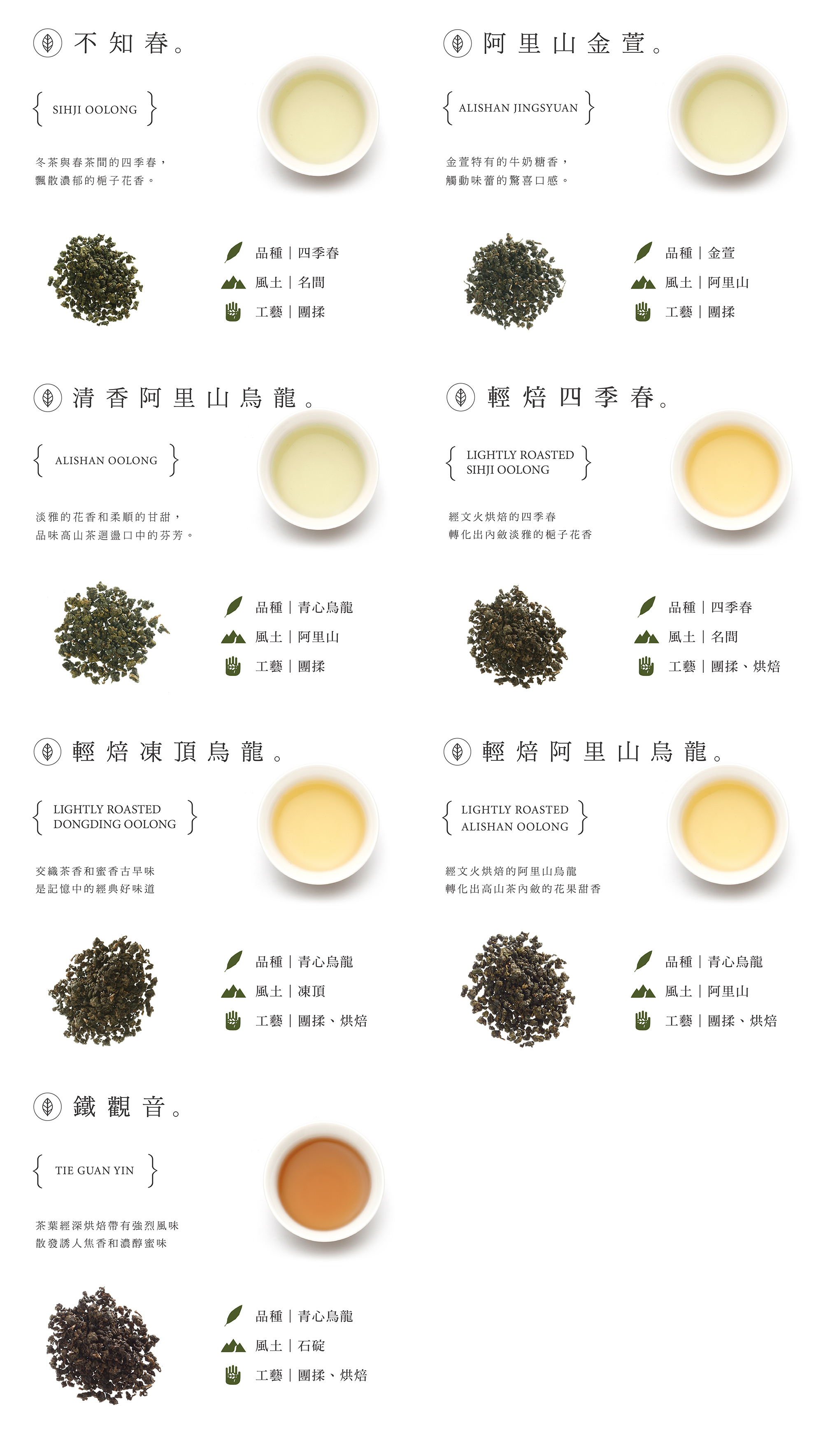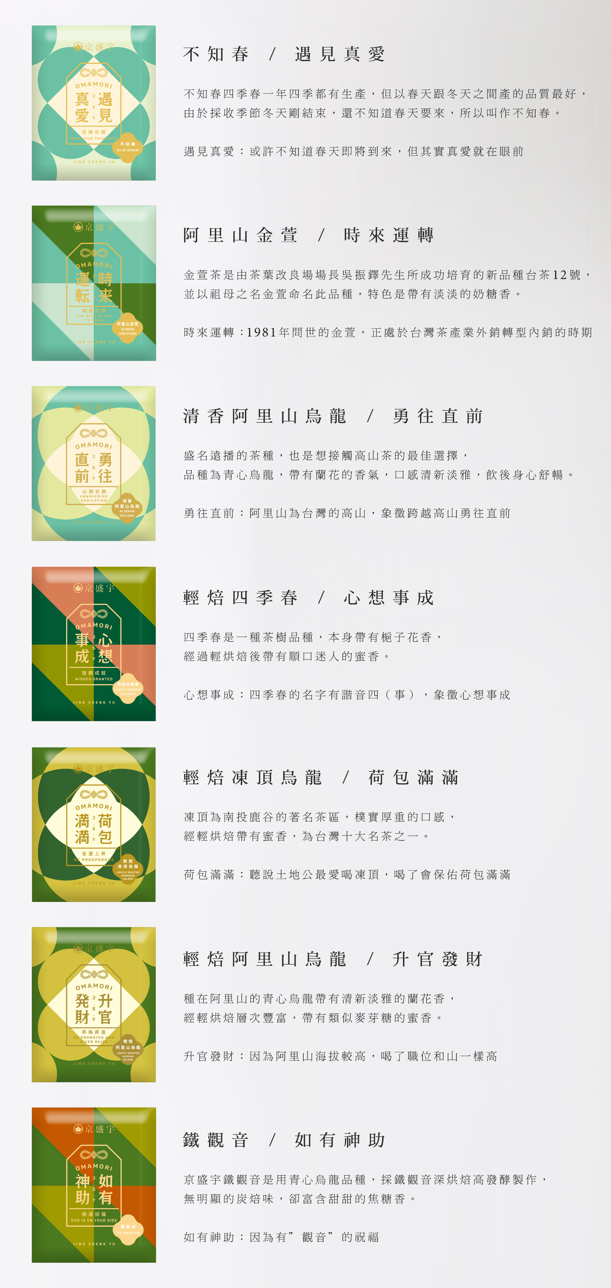 | 淨重 | 不知春-遇見真愛 3g x 50/阿里山金萱-時來運轉 3g x 50/清香阿里山烏龍-勇往直前 3g x 50輕焙阿里山烏龍-升官發財 2.5g x 50 |
