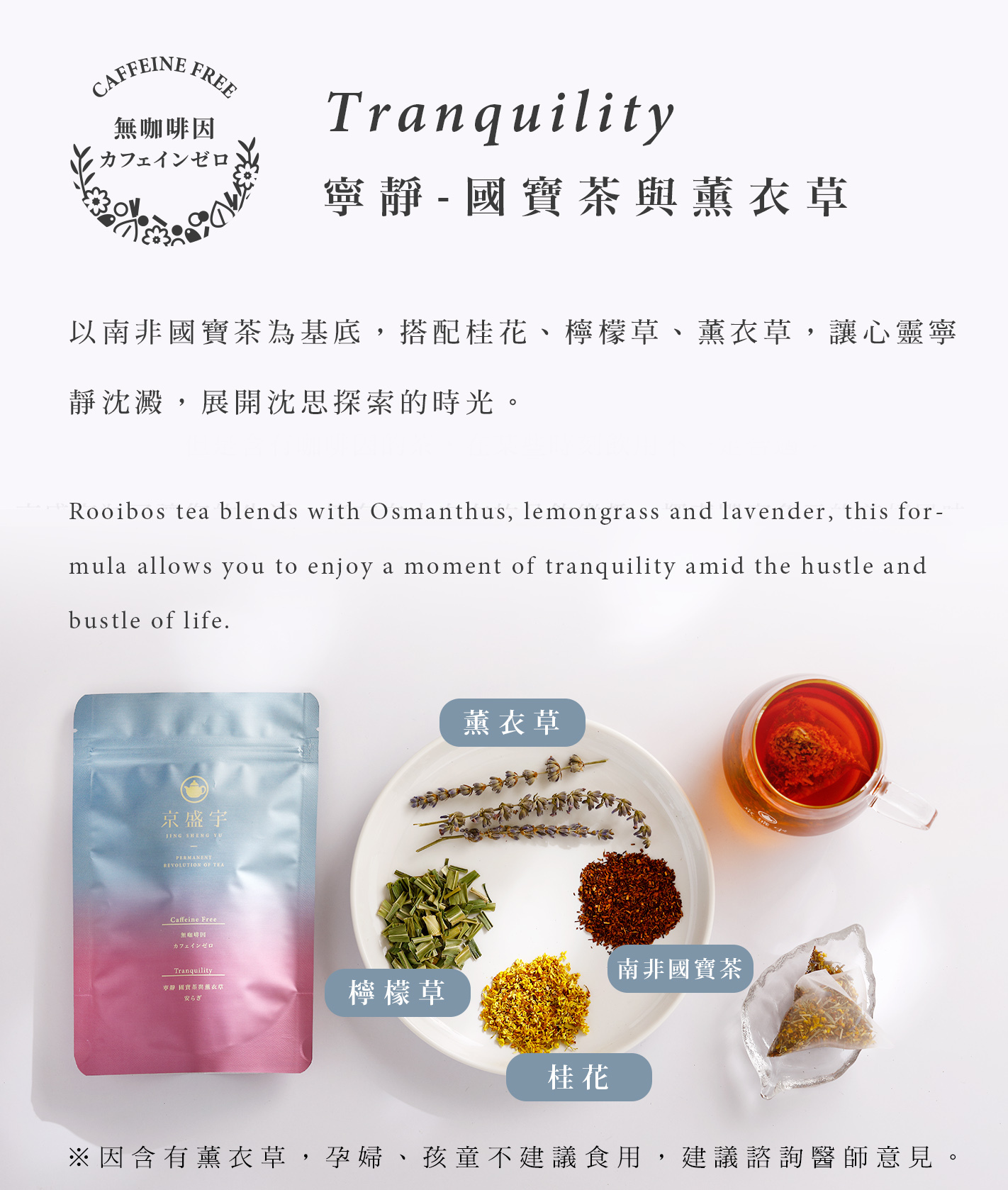 | 成分/產地 | 南非國寶茶(南非)、桂花(中國)、檸檬草(泰國)、薰衣草(法國) |